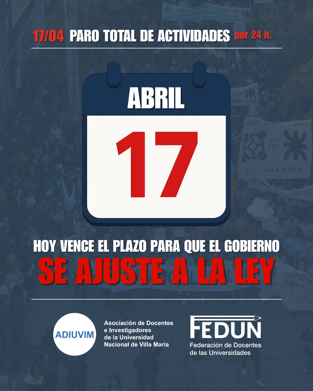 Ante este escenario, ADIUVIM conjuntamente con nuestra federación (FEDUN) advertimos que, de no cumplirse con la ley y no convocarse de manera urgente a paritarias, se profundizará el plan de lucha. Como primera medida convocaremos a una marcha nacional universitaria en defensa de la universidad pública y el salario docente, probablemente para la segunda semana de mayo.