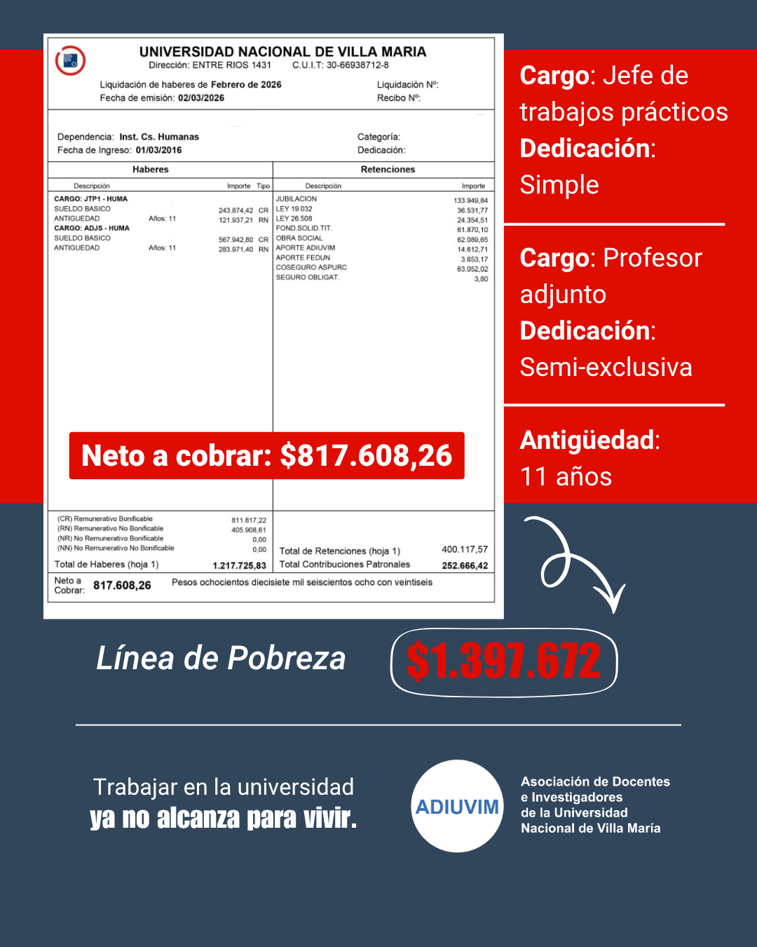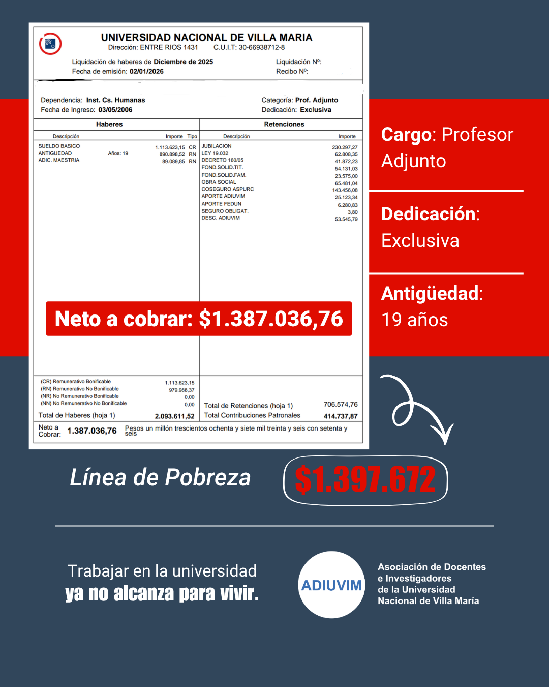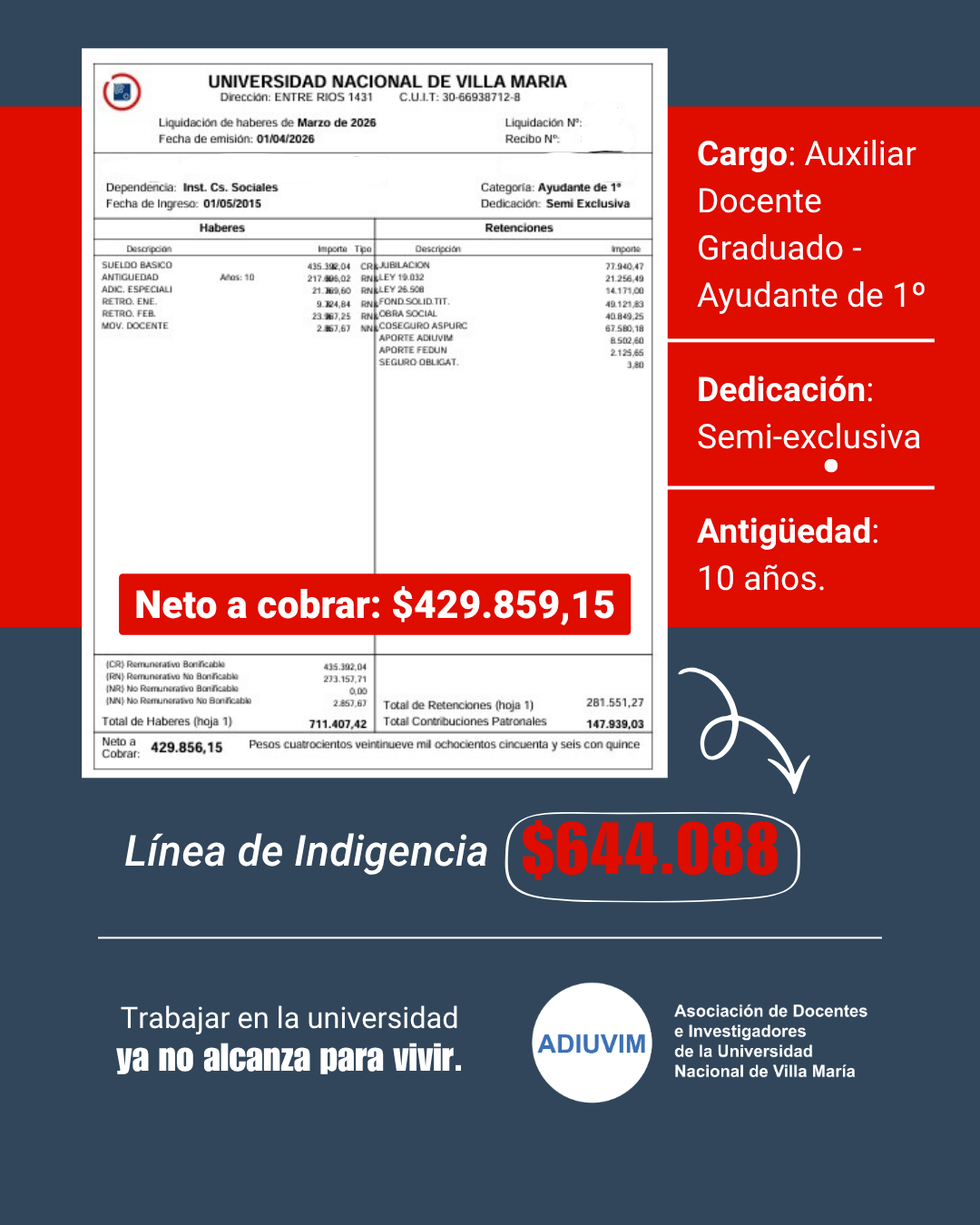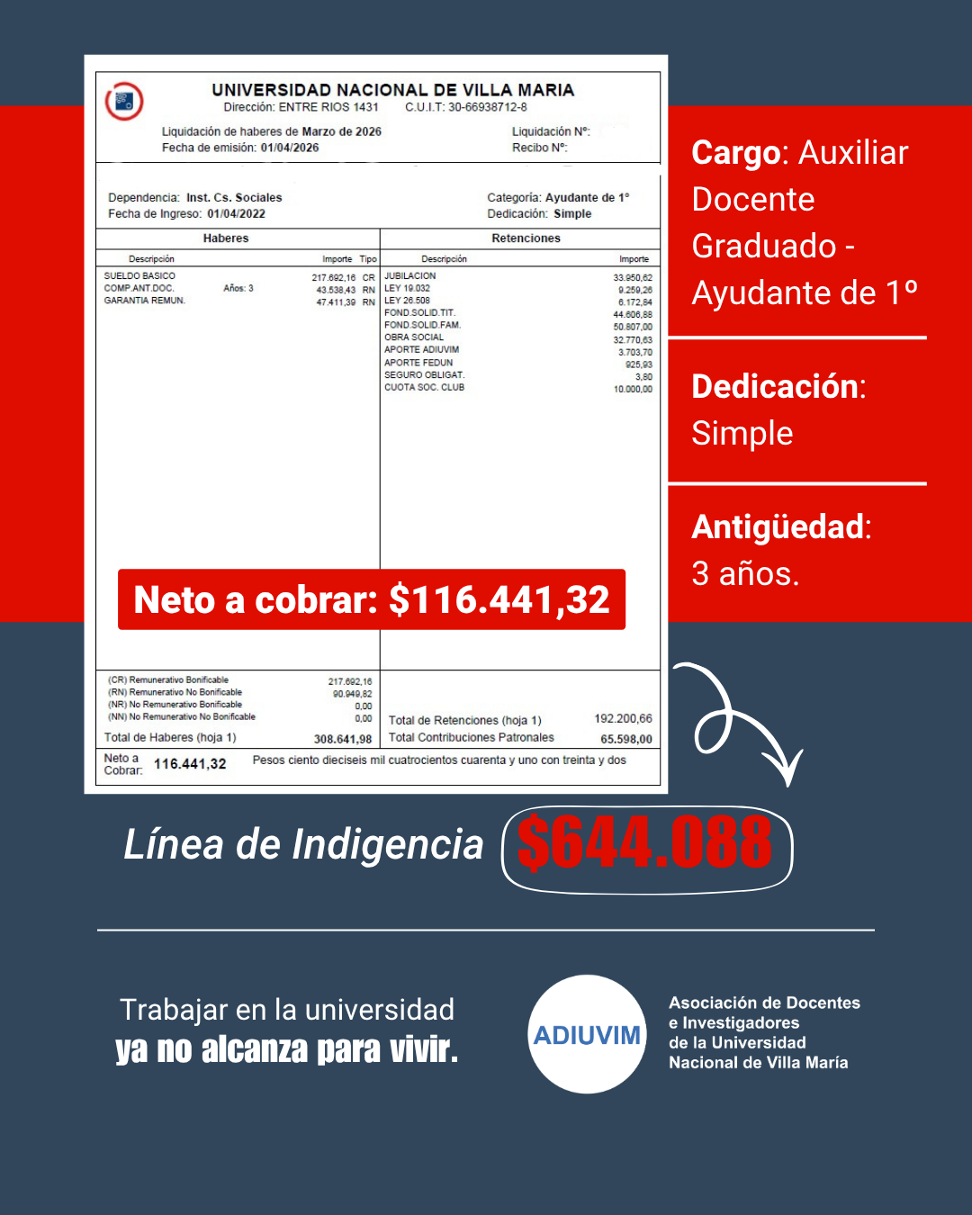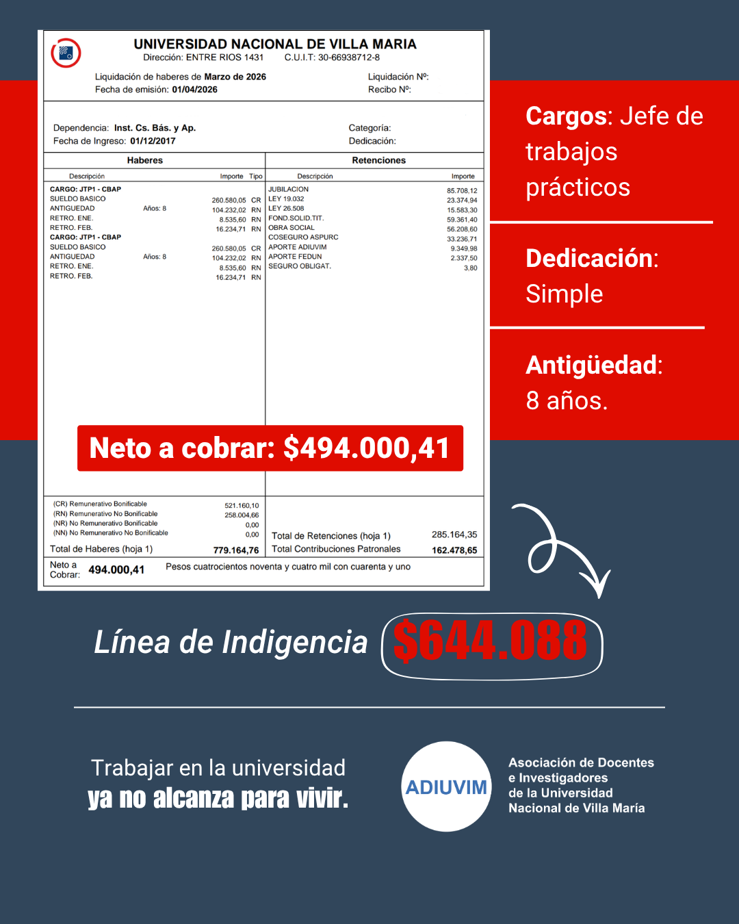 Además, Ricci advirtió sobre el impacto directo de esta situación en las universidades: “Cada vez más docentes tienen que buscar otro trabajo o dejar la universidad porque el salario no alcanza. Así es imposible sostener el sistema universitario”.