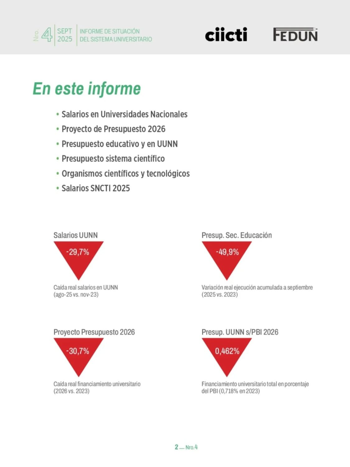 Nuestra federación (FEDUN) junto al Centro Iberoamericano de Investigación en Ciencia, Tecnología e Innovación (CIICTI) presentaron recientemente el Cuarto Informe sobre la Situación del Sistema Universitario Nacional. Se trata de la edición correspondiente al mes septiembre de 2025, y en donde se expone una nueva etapa del proceso de desfinanciamiento y deterioro salarial que atraviesan las universidades públicas, el sistema científico argentino y las trabajadoras y trabajadores.
