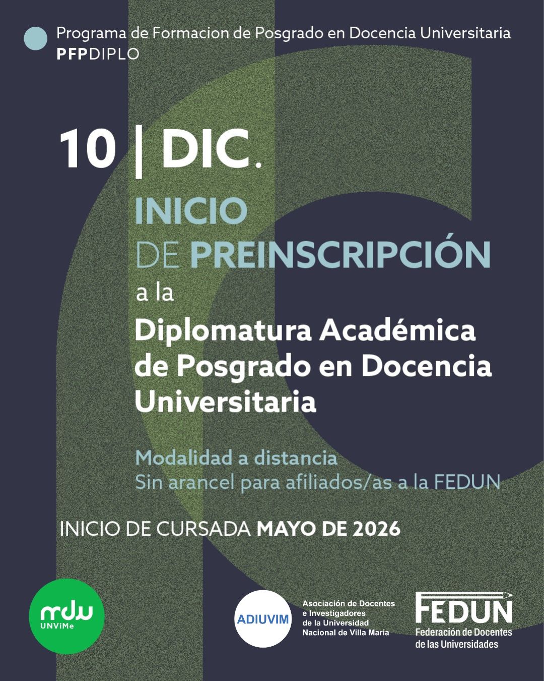 Al igual que lo hiciéramos en otras oportunidades, desde ADIUVIM volvemos a acercarles a nuestros afiliados y afiliadas dos propuestas de formación de calidad, sin costo para quienes formamos parte de la FEDUN y 100% a distancia: la Maestría en Docencia Universitaria o la Diplomatura Académica de Posgrado en Docencia Universitaria.